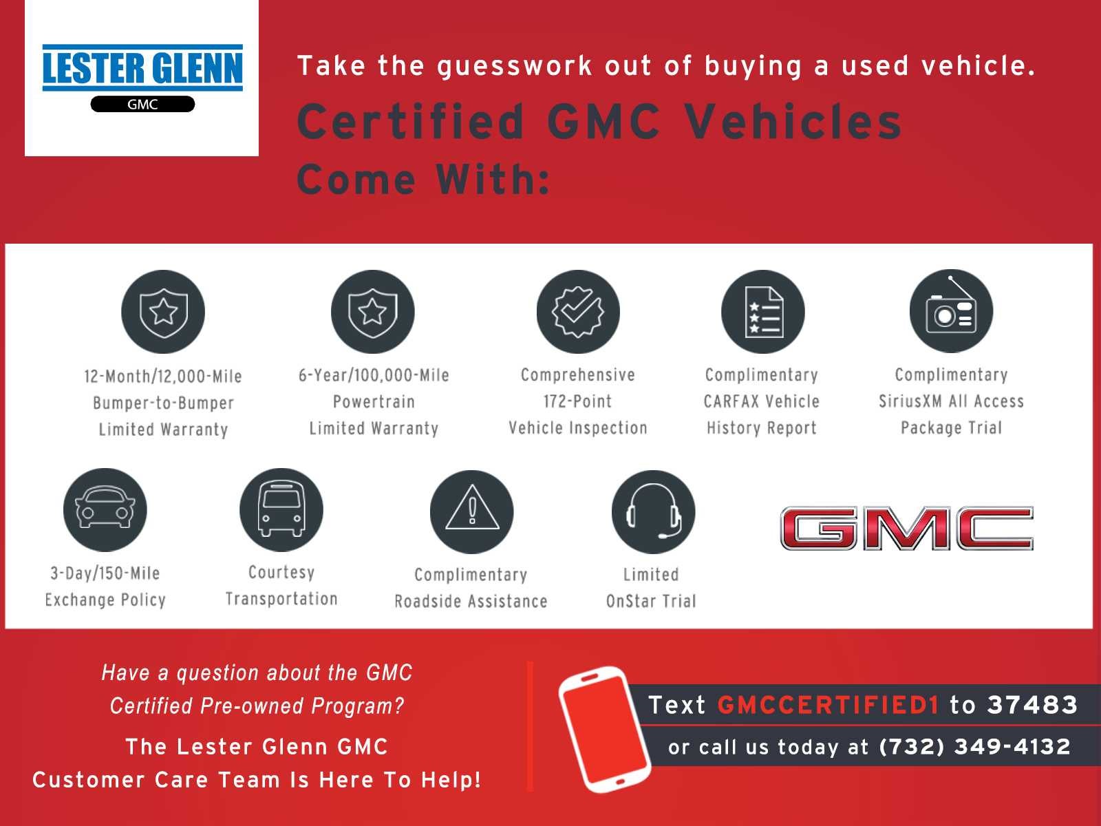 EXPERIENCE THE WAY CAR BUYING SHOULD BE. EXPERIENCE LESTER GLENN! Lester Glenn GMC offers complimentary loaner vehicles and shuttle service while your vehicle is in for service with every pre-owned vehicle purchase! Call now for more details: (732) 240-8830. *Some Connected Services - INCLUDING Remote Start - May Require Subscription*