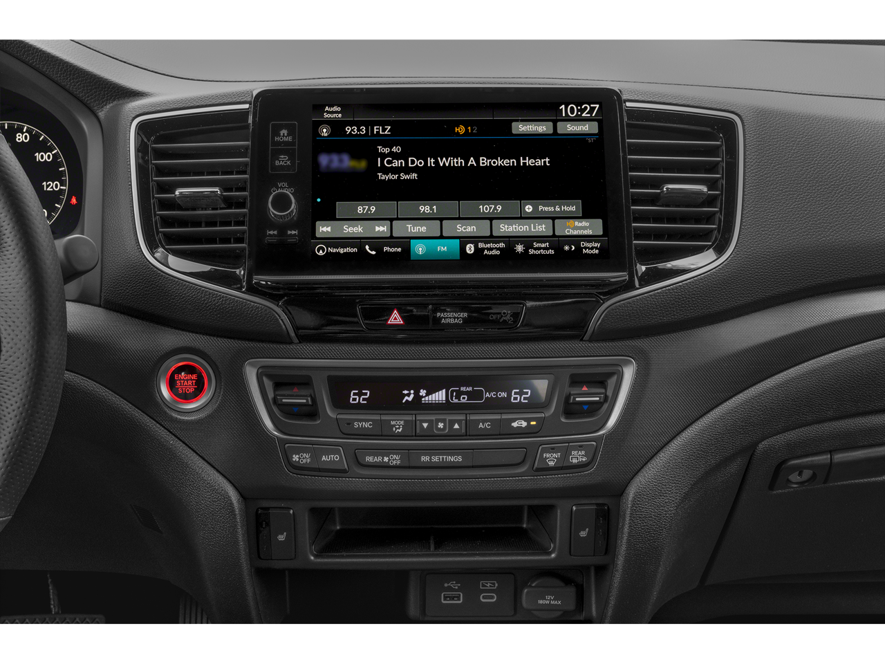 - Radio: 215-Watt Audio System w/7 Speakers -inc: subwoofer, 9" color touchscreen, Bluetooth® streaming audio, Speed-Sensitive Volume Compensation (SVC), wireless Apple CarPlay/Android Auto compatibility, 2.5A USB-A data port in front console, 3.0A USB-C charging port in front console and HondaLink